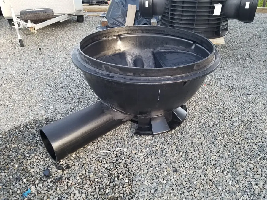This is where the liberation of hydrogen sulfide gas, caused by long residence times, can be the most disruptive. Receiving the sewer into a full plastic manhole chamber solution negates this corrosion risk, and also prevents any scouring that may occur in a concrete manhole. The chamber can be ventilated to a Green Dome filter at this point.