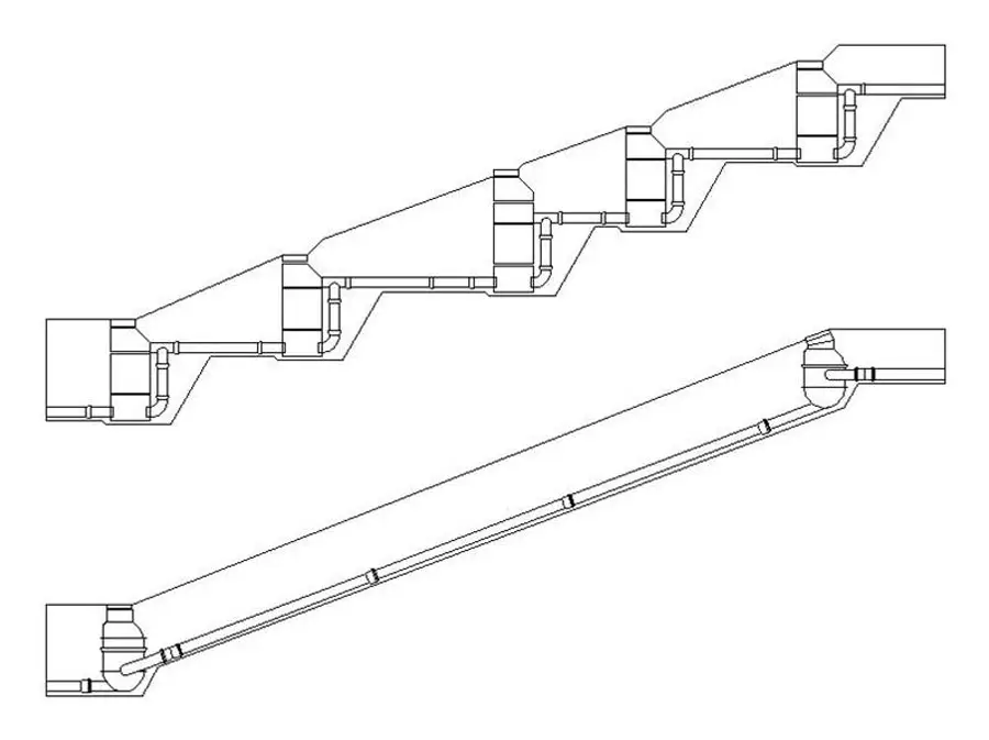 For wasterwater, internal drop pipes can be avoided. The full plastic solution avoids any risk of corrosion due to hydrogen sulfide gas liberation. This is especially useful when using an energy compensation chamber for high flow pressure sewer discharge.